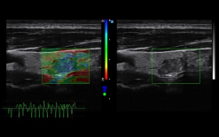 La elastografía se ha adoptado para visualizar la rigidez de los tejidos en tiempo real mediante la compresión externa en los tejidos. La rigidez de los tejidos se puede identificar claramente mediante el color.